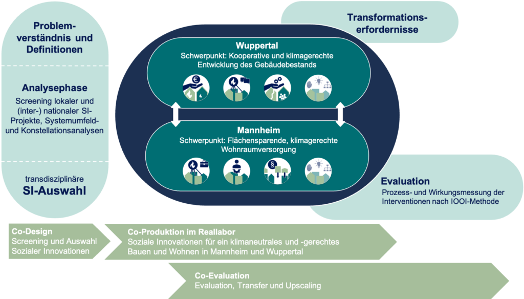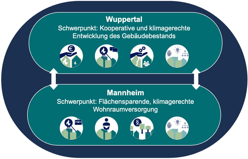 Während in Wuppertal der Fokus auf der kooperativen und klimagerechten Entwicklung des Gebäudebestandes liegt, steht in Mannheim die flächen-sparende, klimagerechte Wohnraumversorgung im Mittelpunkt. Hierbei greifen wir bestehende Innovationslücken auf und erproben koproduktiv und passgenau soziale Innovationen. Zudem nutzen wir die Instrumente des Innovationsmanagements, um bereits vorhandene Innovationen von der Nische in die Breite zu bringen: Aus dem Modell- in den Regelbetrieb.